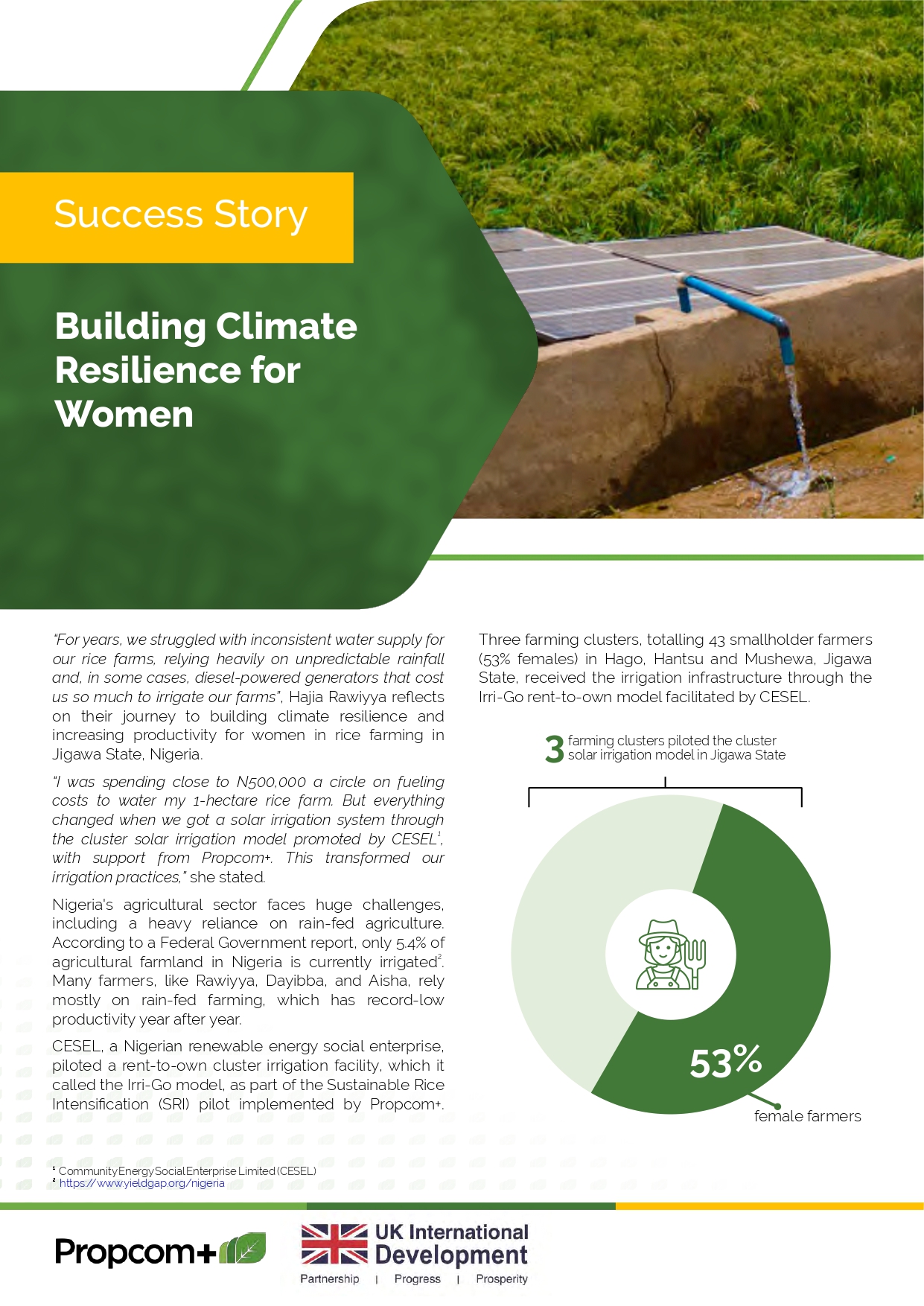 Nigeria’s agricultural sector faces enormous challenges, including a heavy reliance on rain-fed agriculture. According to a Federal Government report, only 5.4% of Nigeria’s agricultural land is currently irrigated. Many farmers rely primarily on rain-fed farming, which has record-low productivity year after year. CESEL, a Nigerian renewable energy social enterprise, piloted a rent-to-own cluster irrigation facility, the Irri-Go model, as part of the Sustainable Rice Intensification (SRI) pilot implemented by Propcom+. Several farming clusters received the irrigation infrastructure through the Irri-Go rent-to-own model facilitated by CESEL.